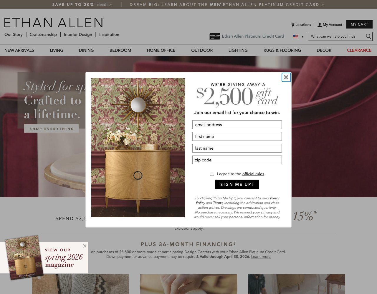 Ethan Allen is a premium home furnishings brand and interior design destination headquartered in Danbury, Connecticut. Founded in 1932 by Nathan S. Ancell and Theodore Baumritter, the company operates a vertically integrated business model. They design, manufacture, and retail their own products rather than acting as a reseller. Customers receive complimentary professional interior design consultations and access to 3D room planning tools to customize their spaces.