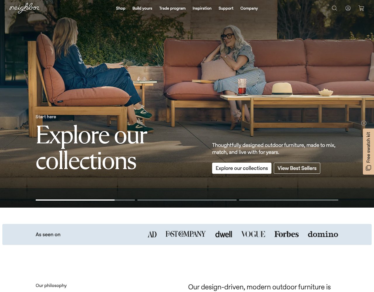 Neighbor is a Phoenix-based outdoor furniture company founded in 2020 by Nick Arambula, Chris Lee, and Mike Fretto. The brand was created to solve a common problem: a lack of thoughtfully designed outdoor furniture that matches the quality and comfort of indoor pieces. They offer modern, durable furniture built for connection and everyday life outside.
