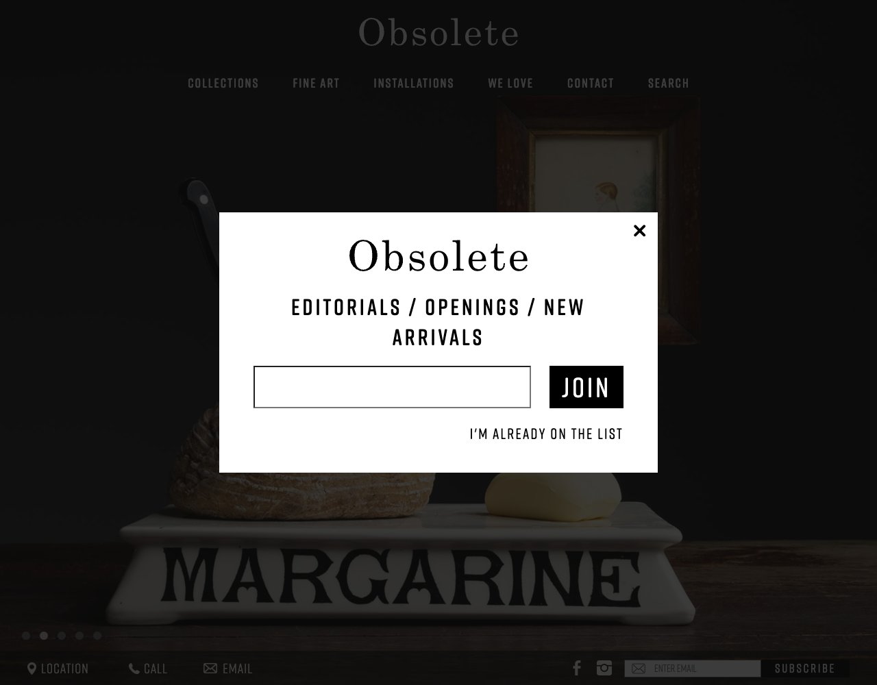 Obsolete is a gallery specializing in rare antiques and vintage design alongside contemporary art, located in Culver City, California. Founded in 1999 by former fashion design director Ray Azoulay, the showroom blends industrial age furnishings with perfectly dilapidated oddities. The inventory is sourced globally. This results in a highly theatrical collection that defies standard categorization.