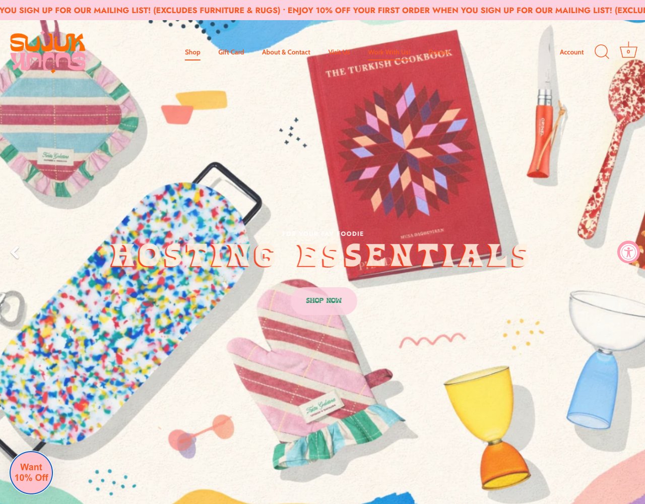 Su'juk is a Brooklyn boutique founded by Su Beyazit in 2012, offering a world of discovery through clothing, vintage items, and home goods. The name is a personal nod to a Turkish breakfast dish and the founder's childhood nickname, reflecting the shop's warm and inviting atmosphere where every piece has a story.